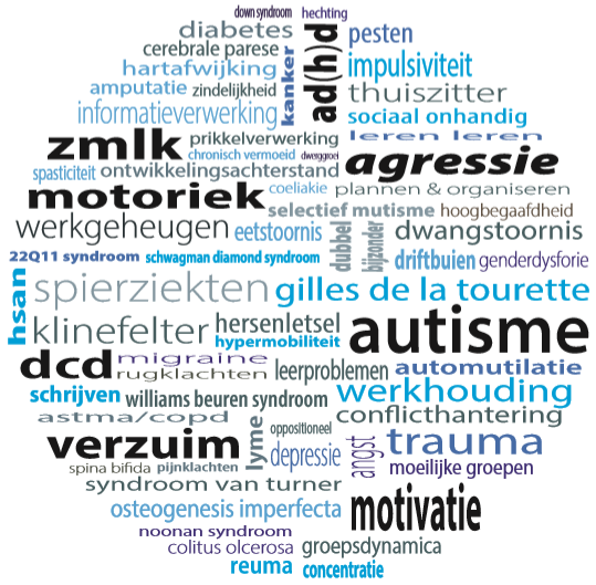De woordwolk geeft een indruk van de expertisegebieden van de ambulant begeleiders van de AED. We proberen onze kennis zo actueel mogelijk te houden en zijn alert op nieuwe kennisgebieden. Onze expertise groeit daarom voortdurend. Denk hierbij bijvoorbeeld aan kennis over longcovid.